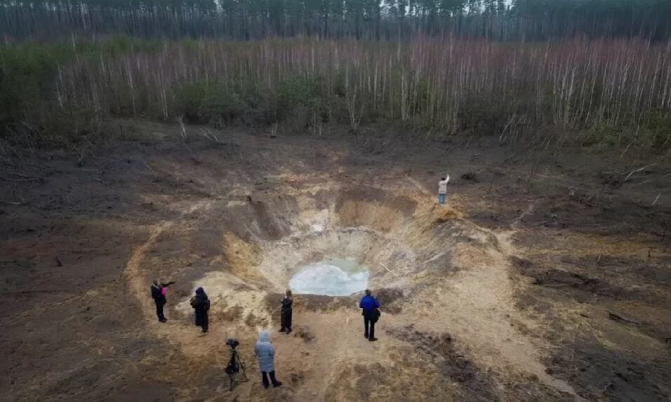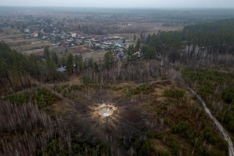 Im Bezirk Buchanskiy in der Region Kyiv hat sich nach dem Einschlag der Rakete ein riesiger Krater im Wald gebildet.